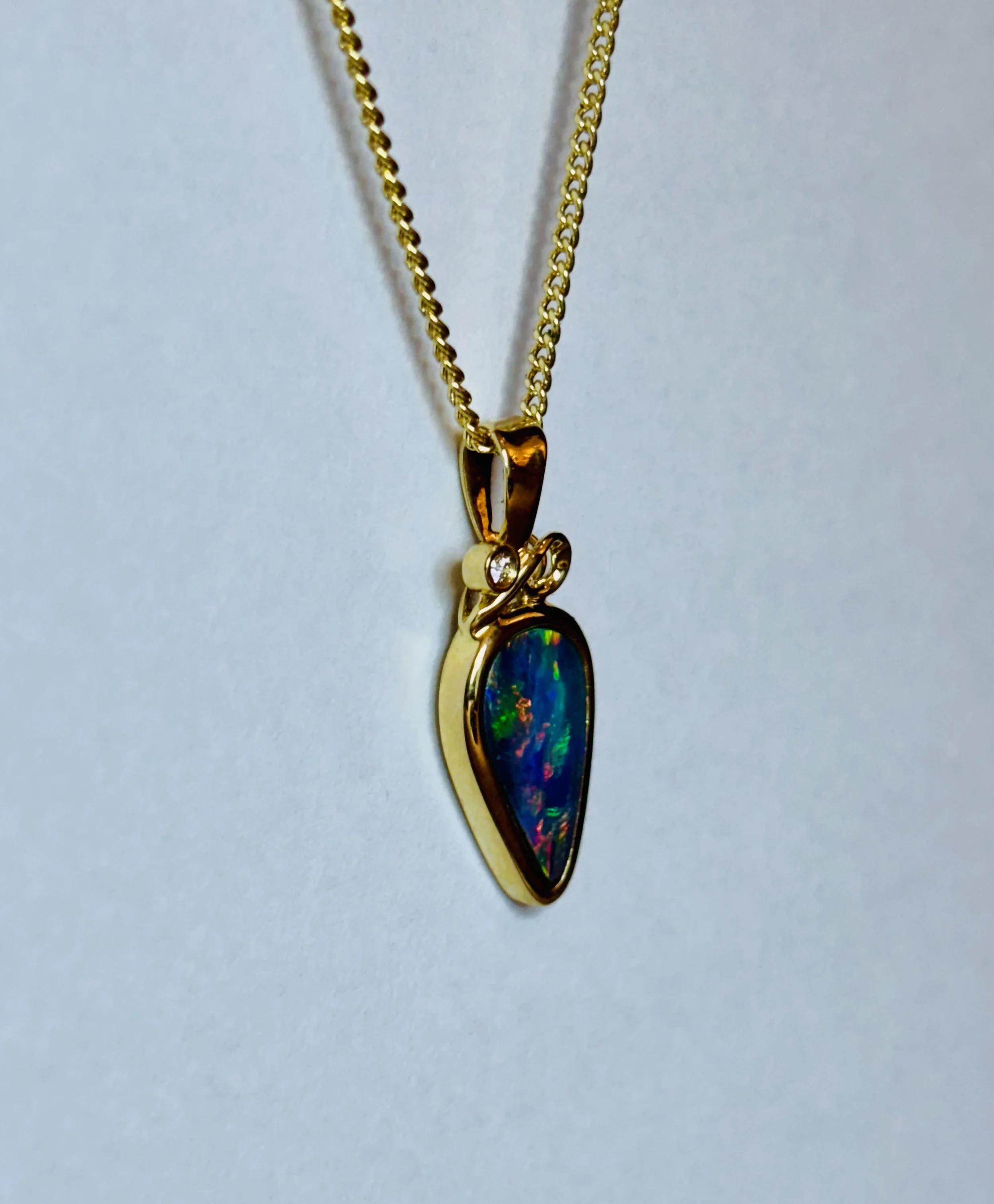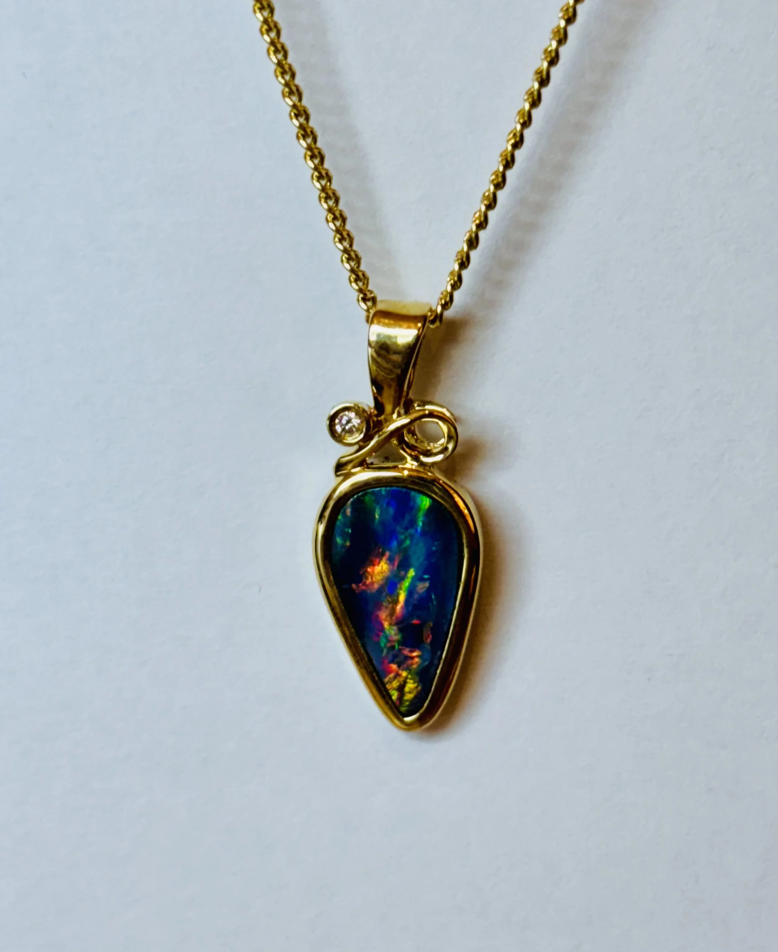 Dear Customer, Please note that our beautiful opals have been photographed in the light. Opal colours will vary according to which lights and angles you hold them in. Also, please enjoy a complimentary, temporary chain as a gift from us. They are gifted at no extra charge so that the items can be modelled straight away. We recommend the separate purchase of a secure, solid gold/silver chain- and do not recommend the prolonged wear of the gift display chain.